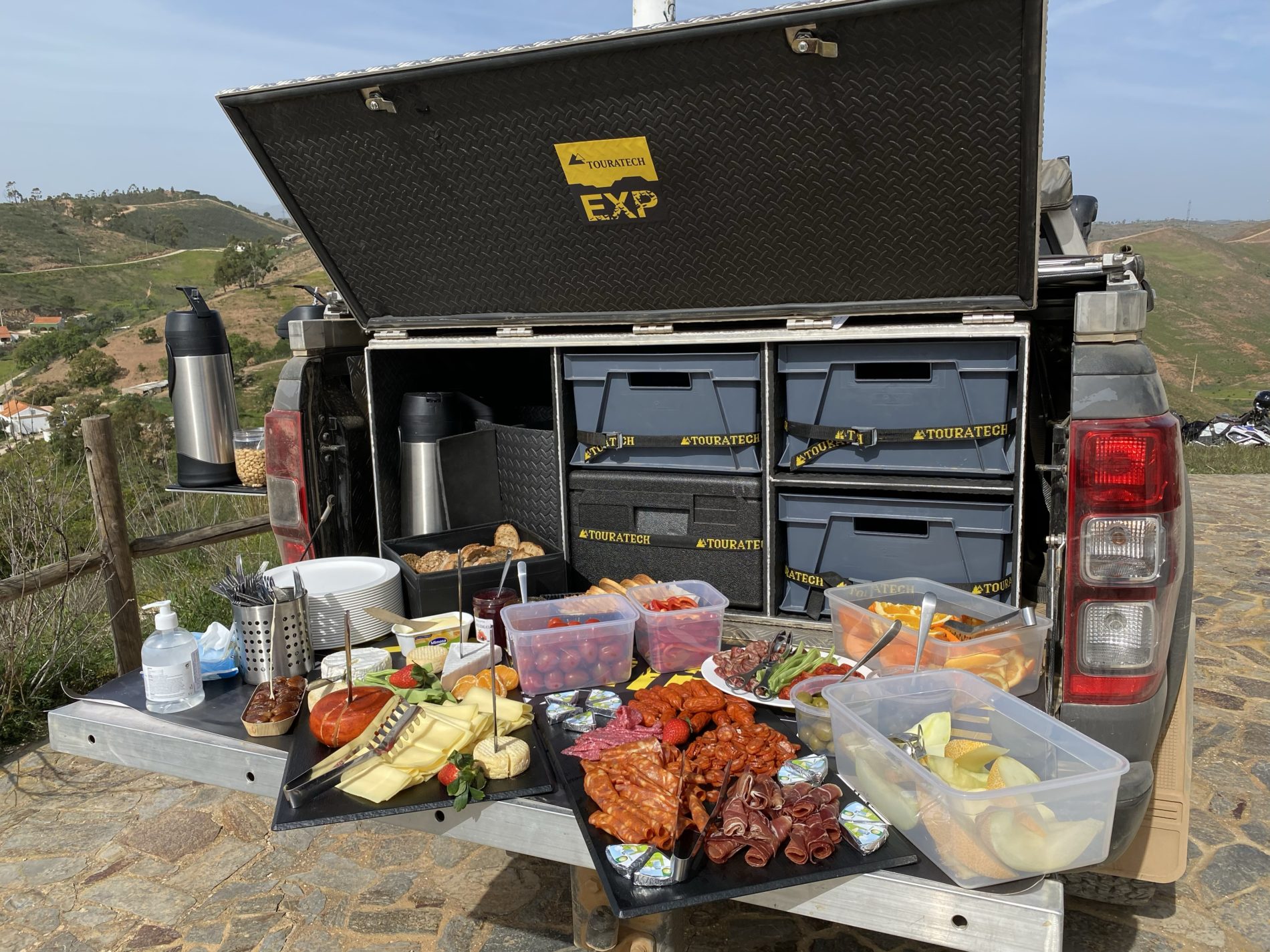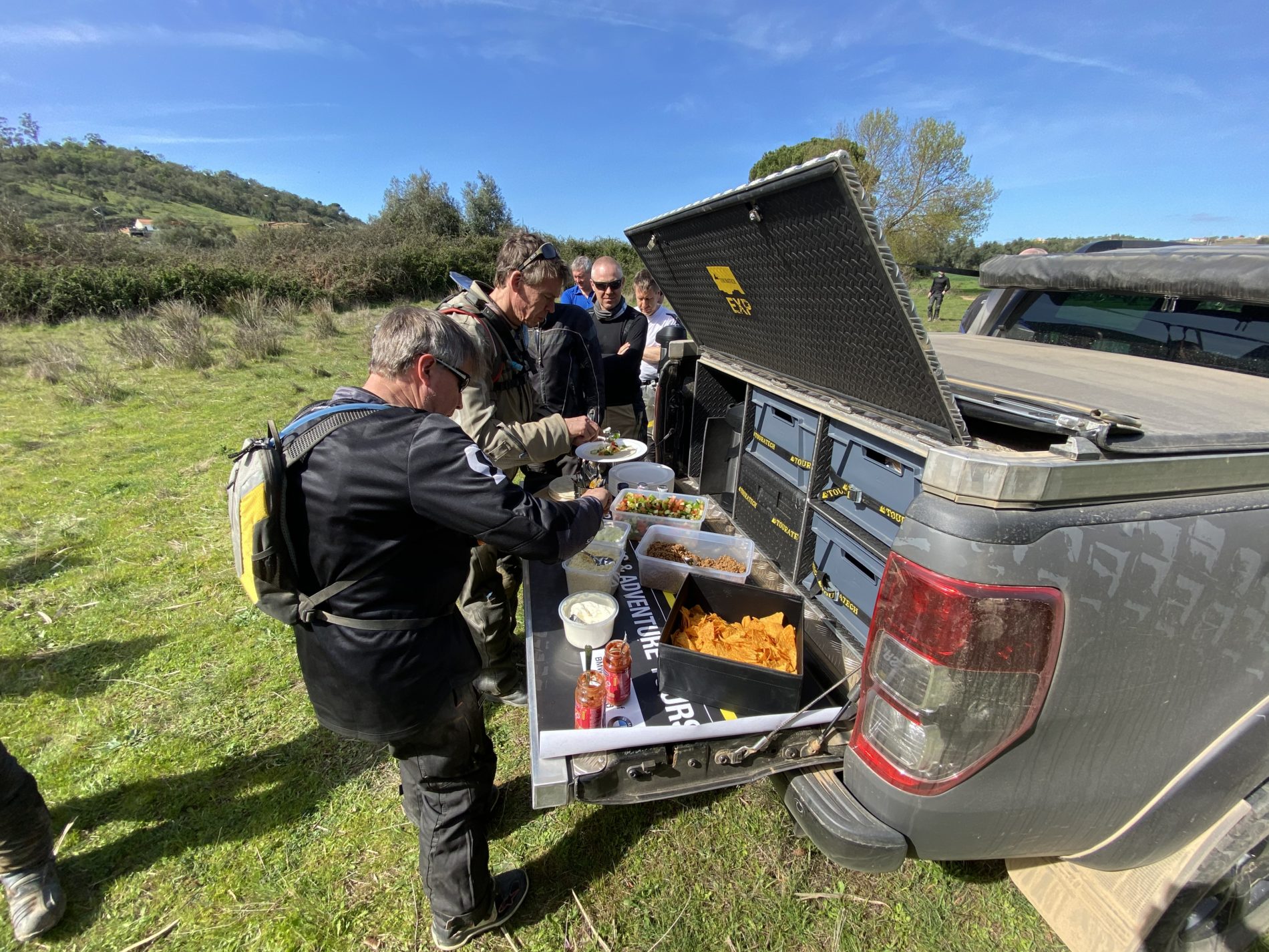 Unsere Basic Group fährt häufig dieselbe Strecke wie die flotten Jungs, aber wir bewegen uns langsamer und vorsichtiger. Und während die anderen dann schon mal rechts hoch preschen oder links runter pfeifen und sich die komplizierten Tracks geben, bleiben wir auf der Hauptroute, konsequent mit allen Hochs und Tiefs bis zur nächsten Kaffeepause oder zum Lunch. Zu den Pausen an reizvollen Aussichtsplätzen, Flussbiegungen (natürlich mit vorheriger Passage) oder Windmühlen finden sich alle ein, man plaudert und lacht und döst in der Sonne, und das Begleitfahrzeug, ein amtlich ausgestatteter Offroad Pickup, steckt neben Ersatzteilen vor allem voller Leckereien.