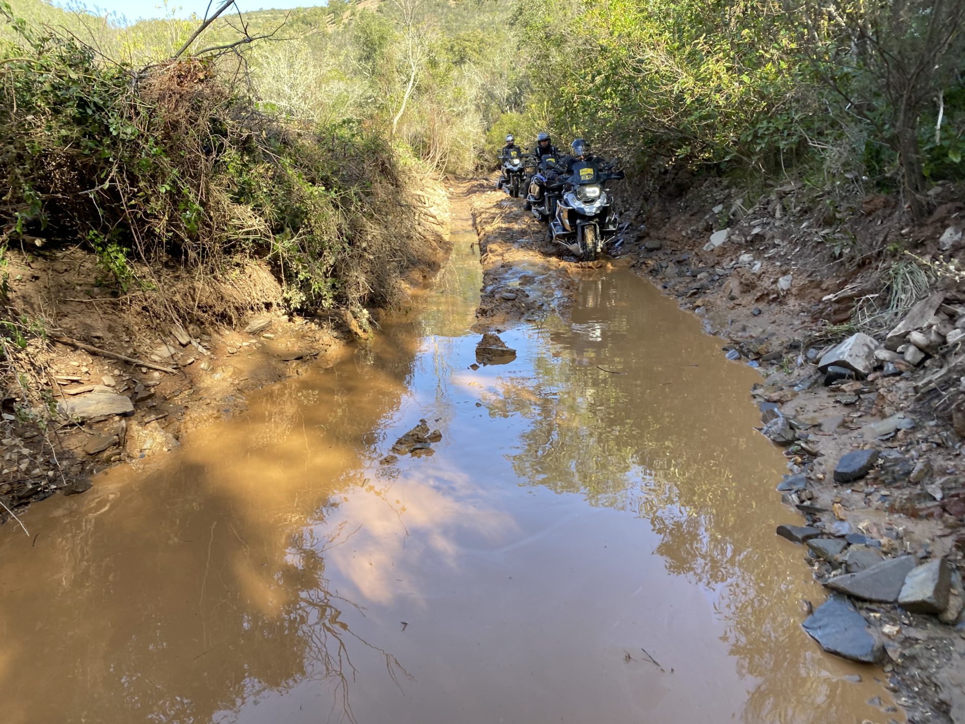 Ein kurzer Weg führt runter zu einer harmlos dahindümpelnden Wasserdurchfahrt, die ist nicht breit. Aber dann doch tief, mit steilen Uferböschungen, schlammig, und am Grund garniert mit großen, rutschigen Steinen. Zum Anlaufnehmen taugt die Anfahrt zur Auffahrt also schon mal nicht. Kaum ist das Hinterrad aus dem Wasser, wendet sich ansatzlos der steile Anstieg auch noch nach rechts. Steijer’s Hill. Legendär. Die Advanced Group stellt sich in einer Reihe hintereinander auf, jeder will es schaffen. Oder in Ehren scheitern. Es nicht zu versuchen, ist keine Option.